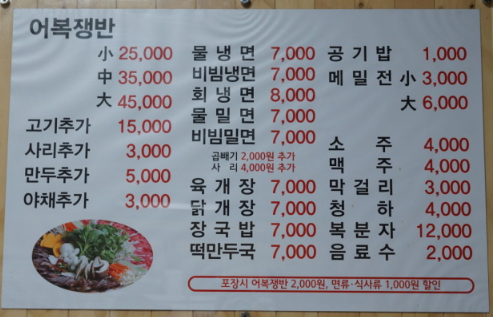 어복쟁반 소 : 25,000원 어복쟁반 중 : 35,000원 어복쟁반 대 : 45,000원 물냉면 평양식 : 7,000원 비빔냉면 함흥식 : 7,000원 육개장 : 7,000원 장국밥 : 7,000원 닭개장 : 7,000원 물밀면 : 7,000원 떡만두국 : 7,000원 메밀전(소) : 3,000원 |