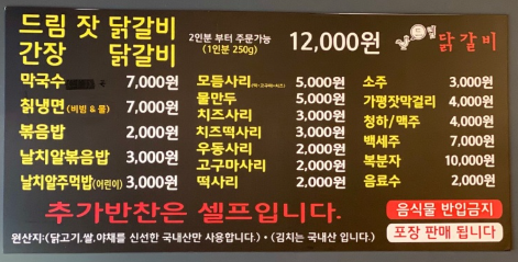| 닭갈비 : 12,000원 막국수 : 7,000원 칡냉면 : 7,000원 볶음밥 : 2,000원 날치알볶음밥 : 3,000원 간장닭갈비 : 12,000원 모듬사리 : 5,000원 물만두 : 5,000원 치즈사리 : 3,000원 치즈떡사리 : 3,000원 우동사리 : 2,000원 고구마사리 : 2,000원 떡사리 : 2,000원 |