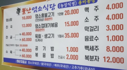 염소전골 중 : 40,000원 염소전골 대 : 60,000원 염소탕 : 10,000원 수육 中 : 40,000원 염소 껍데기 볶음 : 15,000원 진국 : 12,000원 염소 불고기 : 15,000원 염소 갈비구이 : 15,000원 육회 : 35,000원 |