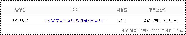 1회 시청률은 5.7%로 드라마 5위, 종합 12위 입니다.
