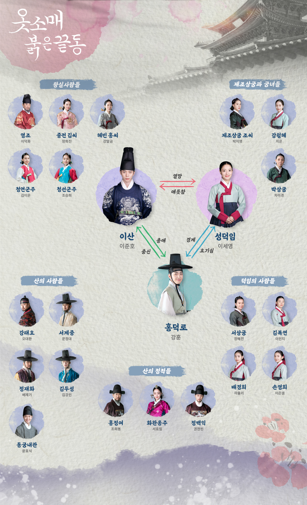 장르: 사극, 로맨스 첫 방송: 2021년 11월 12일 방송 시간: 금토 밤 9시 50분 몇 부작: 16부작 채널: MBC 연출: 정지인, 송연화 극본: 정해리 원작: 강미강 [옷소매 붉은 끝동] 웹툰: KaKaopage [옷소매 붉은 끝동] 출연: 이준호, 이세영, 강훈 |