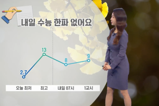 수능 당일 시험장 가는 길, 서울의 기온은 8도선으로 오늘보다 기온이 5도 가량 높겠고, 1교시부터 기온 가파르게 올라서 최고기온 15도로 예상됩니다.