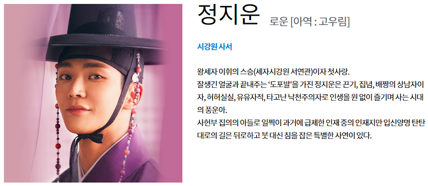 잘생긴 얼굴과 끝내주는 ‘도포발’을 가진 정지운은 끈기, 집념, 배짱의 상남자이자, 허허실실, 유유자적, 타고난 낙천주의자로 인생을 원없이 즐기며 사는 시대의 풍운아이기도 합니다.