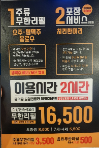 기본 가격 이외에 3,500원을 추가하면 주류 무한리필 서비스를 이용할 수 있습니다.