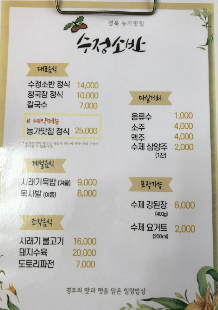 수정소반 정식 : 14,000원 청국장정식 : 10,000원 칼국수 : 7,000원 시래기 불고기 : 16,000원 돼지수육 : 20,000원 도토리파전 : 7,000원 시래기묵밥 : 9,000원 묵사발 : 8,000원 농가맛집 정식 : 25,000원 |