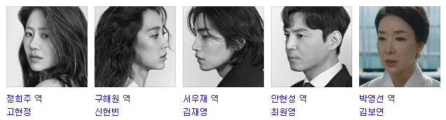 고현정(정희주 역) / 신현빈(구해원 역) / 김재영(서우재 역) / 최원영(안현성 역) / 김보연(박영선 역)