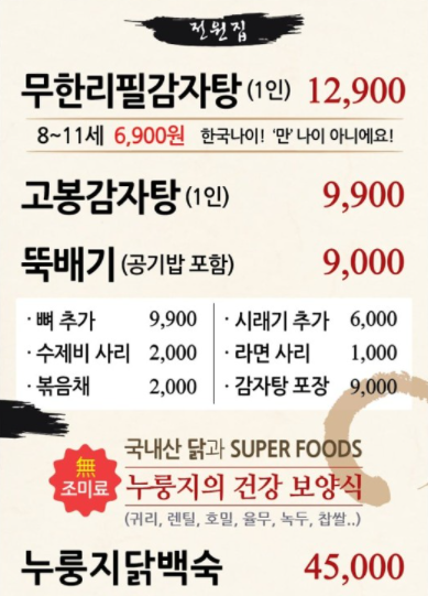 무한리필감자탕 1인 : 12,900원 누룽지닭백숙 : 45,000원 고봉감자탕 1인 : 9,900원 뚝배기 감자탕 : 9,000원 시래기 추가 : 6,000원 뼈 추가 : 9,900원 라면사리 : 1,000원 감자탕 포장 : 9,000원 수제비 사리 : 2,000원 |