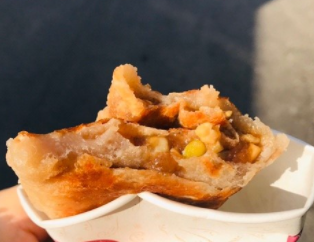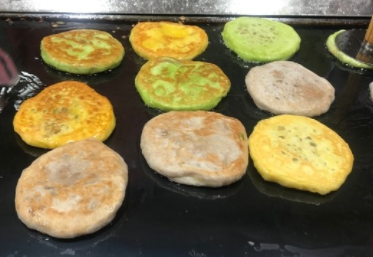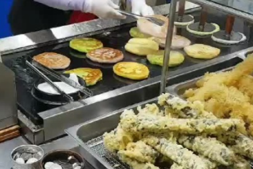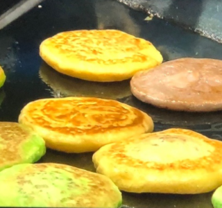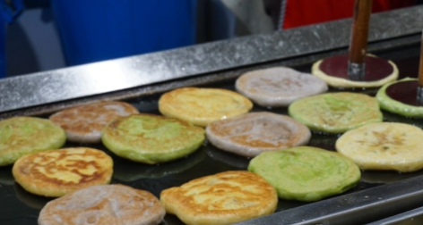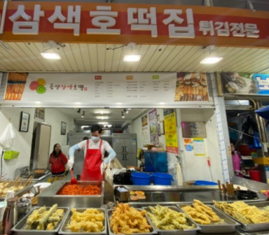 지나가던 사람들의 눈길을 사로잡는 3가지 컬러의 호떡이 보입니다.