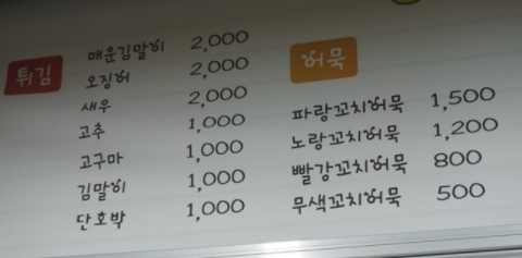 호떡 : 1,000원 떡볶이 : 3,000원 오징어 튀김 : 2,000원 매운김말이 : 2,000원 새우튀김 : 2,000원 고추튀김 : 1,000원 고구마튀김 : 1,000원 김말이 : 1,000원 단호박튀김 : 1,000원 파랑꼬치어묵 : 1,500원 노랑꼬치어묵 : 1,200원 빨강꼬치어묵 : 800원 무색꼬치어묵 : 500원 |