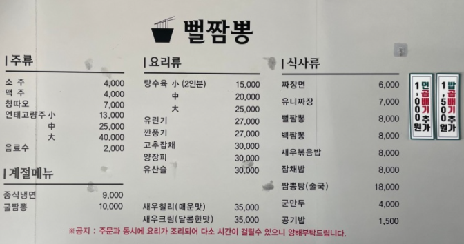 짜장면 : 6,000원 유니짜장 : 7,000원 뻘짬뽕 : 8,000원 백짬뽕 : 8,000원 새우볶음밥 : 8,000원 잡채밥 : 8,000원 군만두 : 4,000원 |