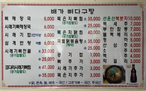 배여사뼈다귀탕 메뉴 및 가격