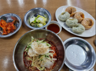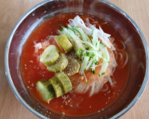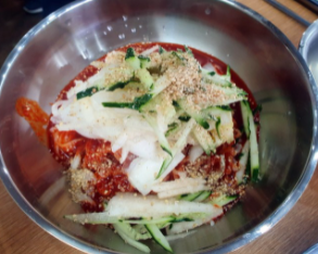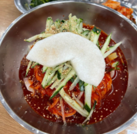 비빔국수는 자가면에 사과 배 파인애플 등의 과일이 듬뿍 들어간 수제비빔양념장으로 만들어 맛이 좋습니다.
