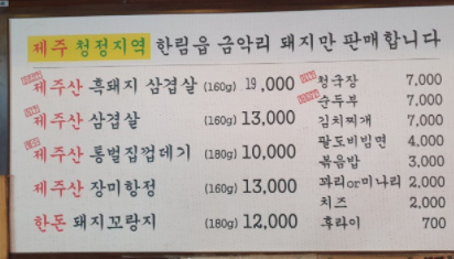 제주산 통벌집껍데기 : 10,000원 제주산 흑돼지삼겹살 : 19,000원 제주산삼겹살 : 13,000원 돼지꼬랑지 : 12,000원 제주산장미항정껍데기 : 12,000원 순두부찌개 : 7,000원 청국장 : 7,000원 김치찌개 : 7,000원 제주산 통벌집껍데기 : 10,000원 제주산 흑돼지삼겹살 : 19,000원 제주산삼겹살 : 13,000원 돼지꼬랑지 : 12,000원 제주산장미항정껍데기 : 12,000원 순두부찌개 : 7,000원 청국장 : 7,000원 김치찌개 : 7,000원 |