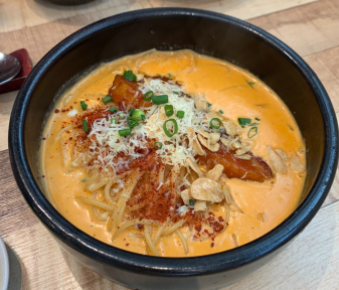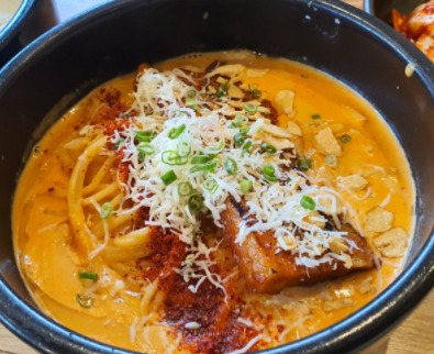 두유국물까르보나라는 고소한 두유로 만든 크림소스에 베이컨과 버섯을 더한 일이이사만의 까르보나라입니다.