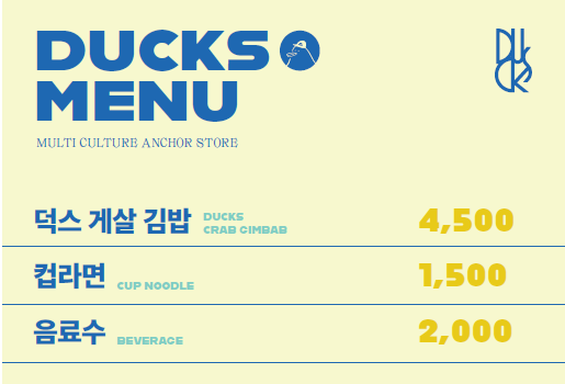 덕스 게살 김밥 4,500 컵라면 1,500 음료수 : 2,000원 |