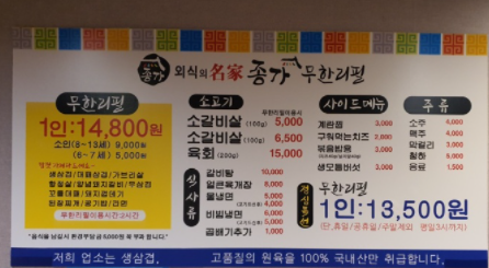 종가무한리필 메뉴 및 가격