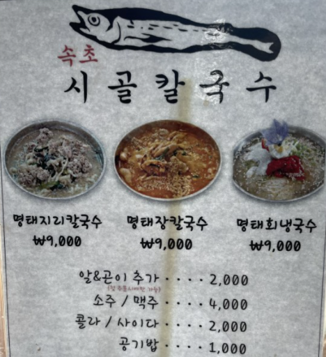 명태장칼국수 : 9,000원 명태지리칼국수 : 9,000원 명태회냉국수 : 9,000원 사이다,콜라 : 2,000원 알,곤이추가 : 2,000원 |