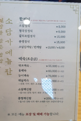 소담정식 : 8,000원 청국장정식 : 8,000원 종명정식 : 15,000원 갈치조림정식 : 15,000원 소감삼계탕 : 13,000원 약초백숙 : 55,000원 옻백숙 : 60,000원 능이백숙 : 70,000원 해물백숙 : 75,000원 총명하신탕 : 200,000원 옛날 닭볶음탕 : 39,000원 약초닭볶음탕 : 55,000원 해물닭볶음탕 : 75,000원 낙지탕탕이 : 30,000원 |