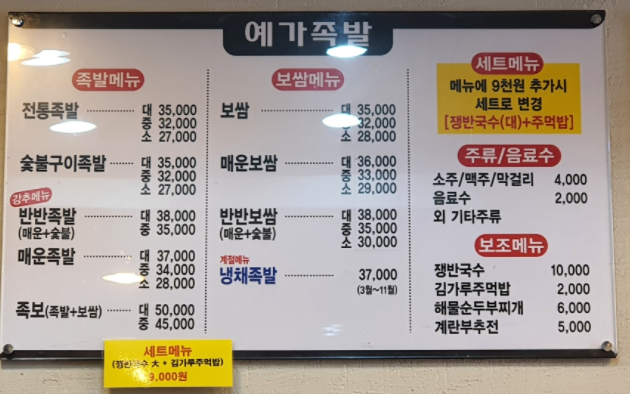 예가족발 메뉴 및 가격
