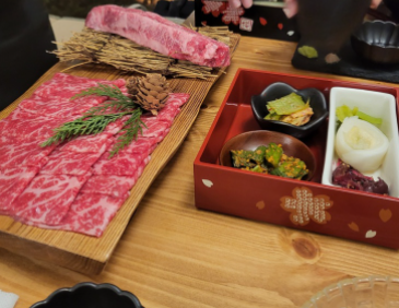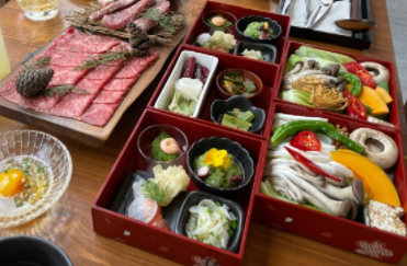 온천집 스키야키 코스(프라임)는 애피타이저와 4가지 어뮤즈부시, 등심스테이크와 관서식 스키야키, 파스타와 후식까지 즐기는 1인 코스 요리로 구성되어 있습니다.