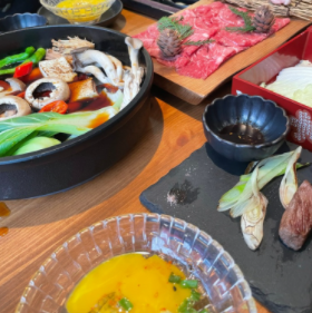 온천집 스키야키 코스(한우2+)는 애피타이저와 4가지 어뮤즈부시, 등심스테이크와 관서식 스키야키, 파스타와 후식까지 즐기는 1인 코스 요리입니다.