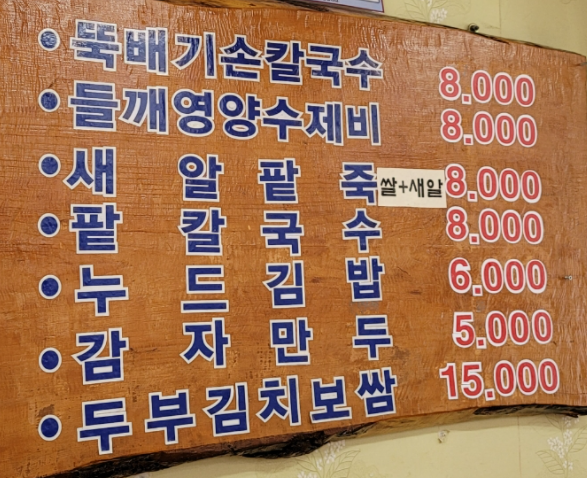 뚝배기손칼국수 : 8,000원 들깨영양수제비 : 8,000원 새알팥죽 : 8,000원 팥칼국수 : 8,000원 누드김밥 : 6,000원 두부김치보쌈 : 15,000원 감자만두 : 5,000원 |