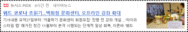 기사내용 요약27일부터 '겨울학기 문화센터 회원모집' 진행 전 강좌 개설 …'라이프 스타일 랩' 매거진 창간 11월부터 본격 시행되는 단계적 일상 회복, 이른바 '위드 ...
