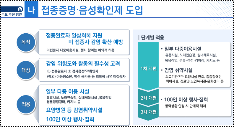 접종증명, 음성확인제는 예방접종 이력이 확인되거나 48시간 이내 PCR 음성확인서를 소지한 사람만이 시설 출입이 허용됩니다.