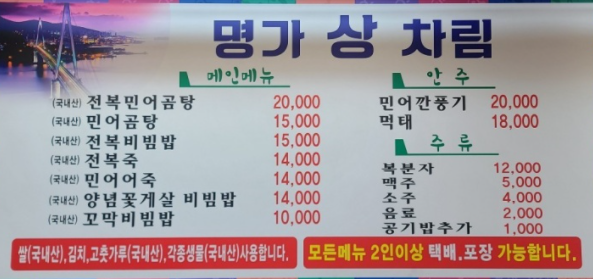 전복민어곰탕 : 20,000원 민어곰탕 : 15,000원 전복비빔밥 : 15,000원 전복죽 : 14,000원 민어어죽 : 14,000원 양념꽃게살 비빔밥 : 14,000원 꼬막비빔밥 : 10,000원 민어 깐풍기 : 20,000원 먹태 : 18,000원 |