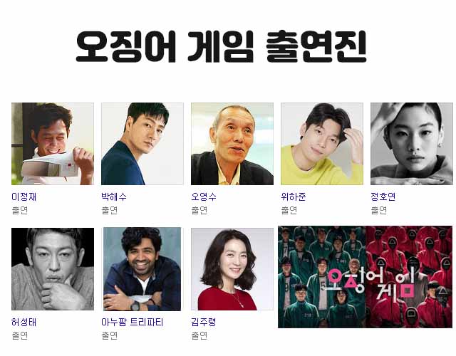출연진 : 이정재, 박해수, 오영수, 위하준, 정호연, 허성태, 트리파티 아누팜, 김주령, 김영옥 등 출연