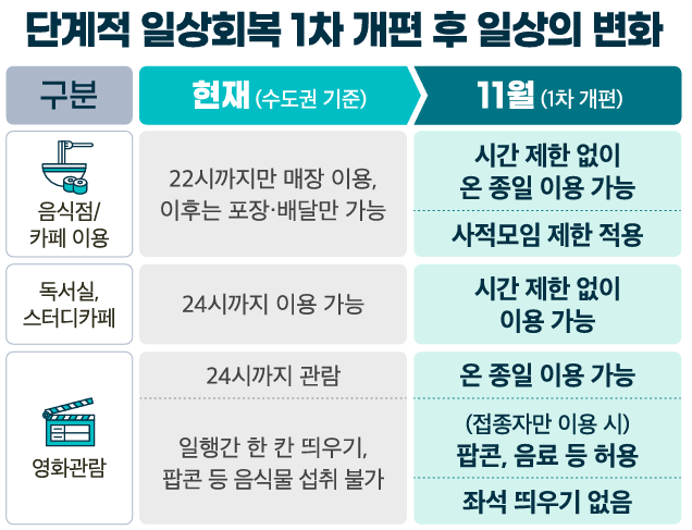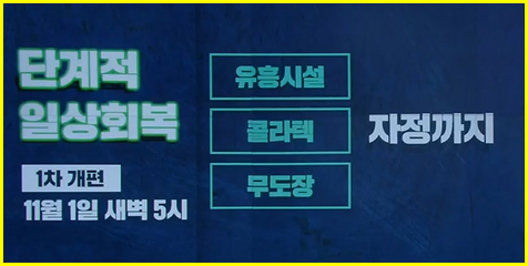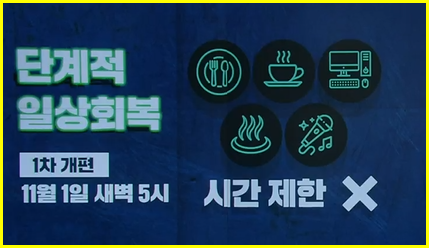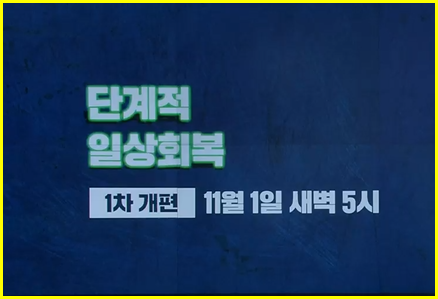 단계적 일상회복(위드코로나) 1차 개편이 시작되는 시점은 11월 1일 월요일 부터입니다.