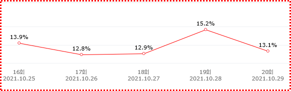 | 2021.10.29 20회 13.1% 종합 3위, 드라마 3위 2021.10.28 19회 15.2% 종합 2위, 드라마 2위 2021.10.27 18회 12.9% 종합 2위, 드라마 2위 2021.10.26 17회 12.8% 종합 2위, 드라마 2위 2021.10.25 16회 13.9% 종합 2위, 드라마 2위 2021.10.22 15회 12.4% 종합 3위, 드라마 3위 2021.10.21 14회 14.4% 종합 2위, 드라마 2위 2021.10.20 13회 13.2% 종합 2위, 드라마 2위 2021.10.19 12회 13% 종합 2위, 드라마 2위 2021.10.18 11회 14.3% 종합 2위, 드라마 2위 2021.10.15 10회 11.7% 종합 3위, 드라마 3위 2021.10.14 9회 14.2% 종합 2위, 드라마 2위 2021.10.13 8회 13.3% 종합 2위, 드라마 2위 2021.10.12 7회 13.2% 종합 2위, 드라마 2위 2021.10.11 6회 16% 종합 2위, 드라마 2위 2021.10.8 5회 12.5% 종합 3위, 드라마 3위 2021.10.7 4회 13.9% 종합 2위, 드라마 2위 2021.10.6 3회 12.2% 종합 2위, 드라마 2위 2021.10.5 2회 13.5% 종합 2위, 드라마 2위 2021.10.4 1회 17.1% 종합 2위, 드라마 2위 |