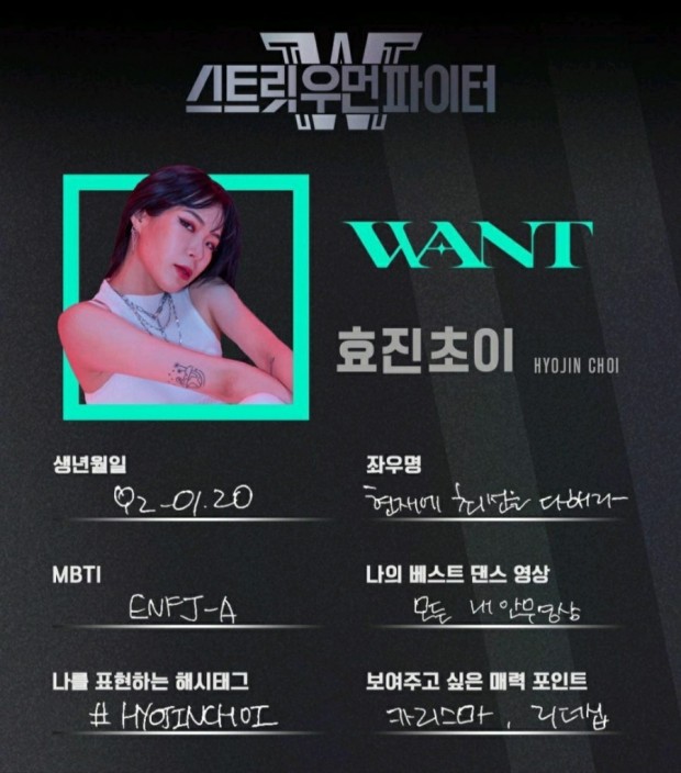 | 나이 : 1992년생 1월 20일 MBTI : ENFJ-A #HYOJINCHOI 원밀리언 소속 학력 키 고향 가족 아직 비공개 |