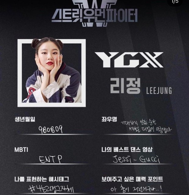 | 본명 : 이이정 (Leejung Lee) 출생 : 1998년 8월 9일 (만 23세) 서울 신체 : 160cm A형, 235mm 가족 : 부모, 오빠 학력 : The King's Academy 소속 크루 : Just Jerk (2014년 10월 ~ 2019년) / NWX (2019년 ~ 현재) 소속사 : YGX MBTI : ENTP |