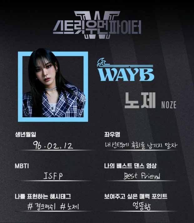 | 본명 : 노지혜 출생 : 1996년생 26세, 대전광역시 학력 : 한림예고 실용무용과 졸업 경력 : 소울스튜디오 / 세븐힐즈 댄스 스튜디오 강사로 활동 키 : 164cm 경력 : 댄스 스튜디오 강사 / 직업 댄서 / 현재 댄스 크루 웨이비 (WAYB)팀 리더 가족 : 부모님 노제 인스타 아이디 : noze_wayb 소속 : WAYB 소속사 : 스타팅하우스 MBTI : ISFP |