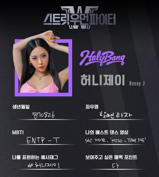 | 본명 : 정하늬 나이 : 1987년생 8월 26일 35세 학력 : 백제예대 졸업 2017년 결성된 홀리뱅 안무로 허니제이, 헤르츠, 타로, 제인, 뮬, 벨, 로아, 이븨로 구성 직업 : 홀리뱅(HolyBang) 댄스크루 리더 kca한국예술원 실용무용과 교수 / 서울종합예술학교 출강 /한림예술고등학교 걸스힙합 수업 허니제이 인스타 아이디 : __honey.j__ |